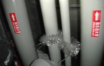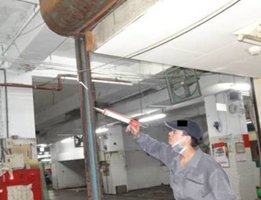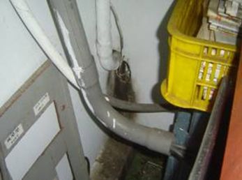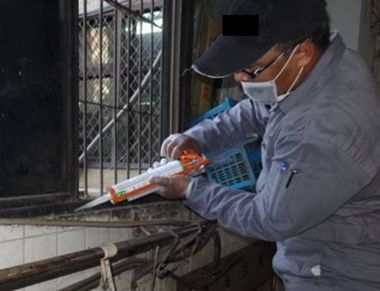 三、封堵阻斷-利用如金屬網、發泡劑、矽力康黏著劑、鋁板等,針對各類孔洞予以封堵,亦可利用如防鼠刺刷綁在管線上來阻斷老鼠利用管線活動。但封堵受限於某些結構裝潢因素可歸納為三個條件,首要能目視的到封堵位置,次為手部得以觸及封堵位置,最後需要有一個平穩安全的工作平台才能施作。