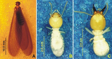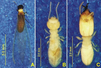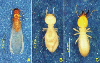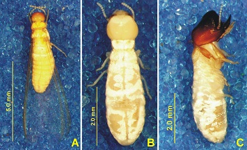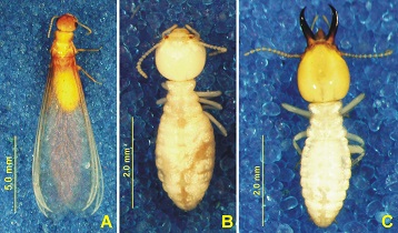 台灣都市地區常見的白蟻物種有五種,分別為台灣家白蟻 (Fig 1)、格斯特家白蟻 (Fig 2)、黃肢散白蟻 (Fig 3)、截頭堆砂白蟻 (Fig 4) 以及台灣土白蟻 (Fig 5)等五種,其中兩種家白蟻的危害率接近九成。白蟻的生活習性隱蔽,有翅生殖型 (Fig 1A, 2A, 3A, 4A, 5A) 分飛離巢落地後,雄性會透過嗅覺尋找雌性,共同尋覓隱蔽的環境挖洞躲藏,之後交配,兩者就成為蟻王與蟻后,蟻后會產下第一批卵,蟻王蟻后會用體內處存的脂肪與蛋白質,代謝後轉成液體食物,餵食孵化的幼蟻,幼蟻蛻皮三次後成為能蒐尋食物的工蟻,往後工蟻就會負責巢內大部分的工作,蟻王與蟻后就專注在生殖上,工蟻 (Fig 1B, 2B, 3B, 4B, 5B) 在巢內約占總個體數95%,部分的幼蟲可以再蛻皮成為兵蟻,兵蟻 (Fig 1C, 2C, 3C, 4C, 5C) 負責防禦外敵,約佔總個體數5%。蟻巢第一年的個體數很少,僅有數十隻個體,第二年也僅有一百多隻,之後個體數增加會受到食物量與環境適合度的影響,在良好環境與食物充足的情況下,白蟻在5-7年後,可以成長為成熟的巢,家白蟻、土白蟻、散白蟻的個體數都可以達到一百萬隻,堆砂白蟻則可達數千隻,此時巢中少數的幼蟲就會發展成為有翅芽的個體,經過數次蛻皮後,長成具有完整翅的有翅生殖型個體,在季節適合時,飛出巢中,尋找配偶,大部分的有翅生殖型都會被螞蟻、蜘蛛、壁虎、鳥類等天敵捕食,僅有極少數 (< 1 %) 的有翅生殖型個體可以成功築巢。